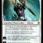 Que podemos decir del héroe de la edición, este personaje ha tenido un desarrollo notable. La tragedia griega que la sigue, el sacrificio del héroe, el sacrificio por el otro. Gideon es nuestro Gerrard del mundo moderno. Un caminante que ha marcado hitos memorables en magic. Utilizando nuevamente la legendaria BlackBlade. No quiero spoilear a nadie, pero su destino ya esta sellado. Gideon es una criatura por tres, indestructible, que la verdad será una de las cartas más utilizadas en standard y quizás hasta vea uso en modern. Este Gideo se ha ganado su lugar en commander, porque no solo nos permite tener una criatura con buena resistencia, y que alimenta posiblemente a nuestro commandante con su primera habilidad, sino que también nos brinda la posibilidad de exiliar un permamente, y todos sabemos que siempre es bueno exiliar algo a ese molesto jugador.